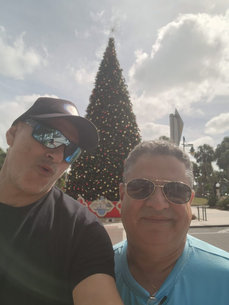 A few days later, the adventure continued west toward Sarasota, where cousins Maggie and her husband Saleh were waiting. They met up in the charming Sarasota town center, filled with boutique shops, palm-lined walkways, bubbling fountains, and the sounds of soft live music drifting from local cafés. They were putting up Christmas decoration and we took pictures with the Big Christmas tree.